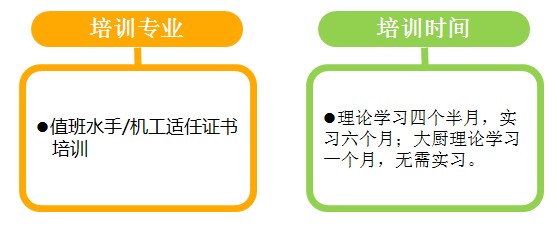 学习课程:水手工艺、水手值班、水手业务、航海英语、熟悉与基本安全培训、机工工艺、机工值班、机工业务、轮机英语、熟悉与基本安全培训、精通艇筏与救生艇培训。