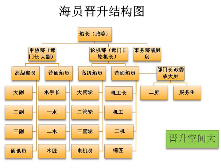 职务层次:按职务层次划分,海员分为高级海员和普通海员两大类。高级海员从事技术管理工作;普通海员(水手、机工)从事一般技术性工作。按专业性质划分,分航海技术专业和轮机工程专业。分别负责船舶航行和船舶机械的维护保养。