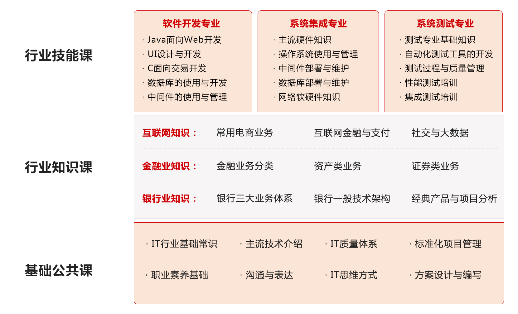 培训内容针对金融与互联网行业的开发、测试与系统集成岗位,具备极高的就业竞争力。培训方式采用北京面授培训,2-3个月的学制,包括用人单位的实际操作实习,并提供真实工作经历证明文件。培训、实习结束后直接上岗工作。
