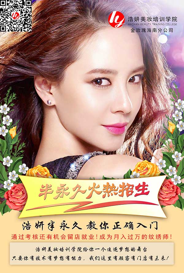 海口浩妍美妆培训学院,一家专业从事美容行业培训的大型综合服务机构,我们提供纹绣,美甲,皮肤管理,医学咨询等教育培训,仪器及耗材,就业服务等美业全站式综合服务。我们始终坚持技术与美学的创新融合,走在世界美容行业的前列,与全球尖端的科研机构,教育机构,医美设备生产商,院线产品生产商等展开广泛合作。我们致力于将前沿的产品技术,新概念流行趋势,东西方美学的精华融会贯通,保证每一位学员都能在短时间有效地掌握尖端技能,完成完美蜕变。名师辅导,软皮人脸实操训练,零基础入门轻松上手,学员终生免费复训。一技在手,一生无忧!