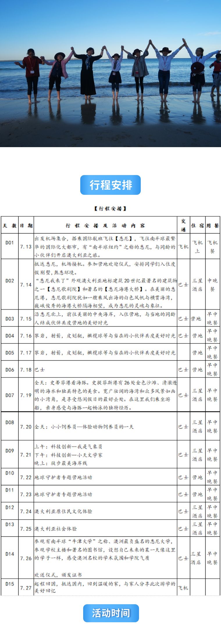 1.中澳学生联谊体验:中国学生有机会与本地学生一起进行各类文体活动及野外探险,在活动中进行交流和学习,建立相互理解和纯真友谊,同时中国学生也有机会作为小使者能给澳洲学生推广中文和中国文化。