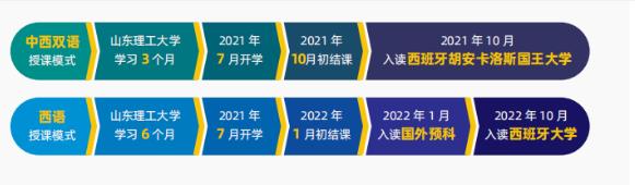 学生在山东理工大学全日制学习6个月衔接课程,达到西班牙语A2等级水平,进入国外大学西语预科学习8个月,预科学习部分包括语法,语音,写作,阅读,文化,历史等,达到研究生入学要求的西班牙语B2等级后,进入西班牙知名大学硕士专业学习,学制1年。