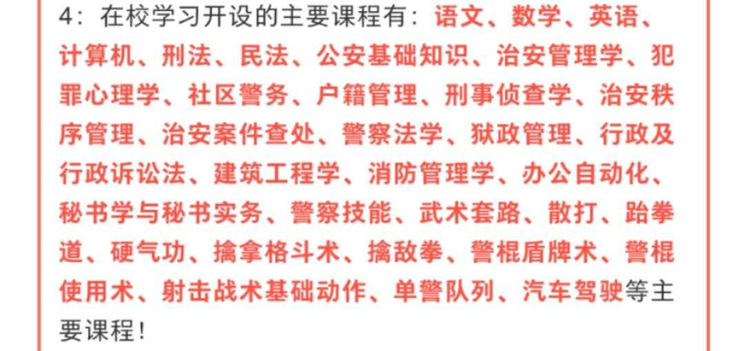 学校严格执行党的教育方针,坚持“从严治校、从严育警”的办学理念,以培养政治合格、专业过硬、作风优良、纪律严明的合格毕业生为目标,对学生实行全封闭、军事化警务管理。加xysfjcxx可了解到更多,做到“以人为本、以军治校”。更注重公安、法律等专业知识的教学。加强对学生军事警体能力、实践能力等专业技能的培养,使之成为“文能办案,武能擒敌”的全面发展的警用人才。学生在校统一着人民警察服装,规范警容风纪。学生在学习期间,除专业知识和技能学习外还可在校内接受汽车驾驶技术培训。