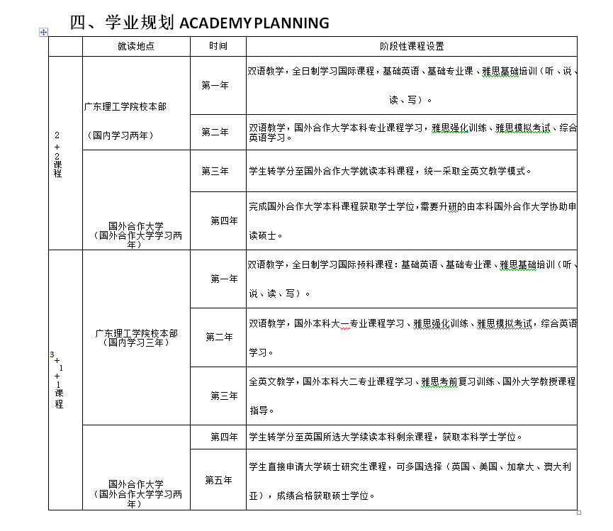 3、国际化教育:采取英式教学模式,小班授课,互动式教学。学生专业课教材为互认学分教材,并在教学过程中严格执行国外大学专业教学大纲,采用中英双语教学。为了让学生在国内学习阶段尽可能适应英国教学模式,学校为学生设置了严谨的教学计划。确保学生充足的课时及教学质量。国外合作大学委派教师对项目任课教师进行教学指导,并委派教学审核小组到广东理工学院进行学生成绩和教学内容的审核,通过审核的学生才有资格进行下一阶段的学习。