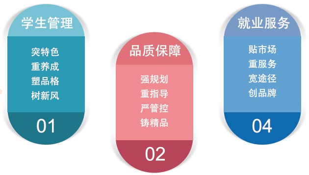 学院在人才培育过程中深化与市场、企业的融合,注重学生过程性评价;秉承“厚基础、强技能、重实战、育正才”人才培养理念,充分发挥学生管理的“突特色、重养成、塑品格、树新风”的职能定位,充分发挥品质管理的“强规划、重指导、严管控、铸精品”的职能定位,充分发挥就业服务的“贴市场、重服务、宽途径、创品牌”的职能定位,四大职能合力形成了自有的管理特色。