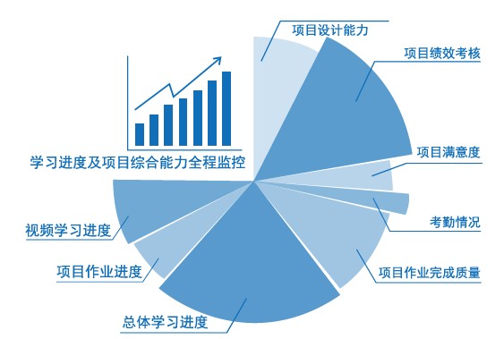 学院采用学生学习信息系统对每个学生的学习进度及项目能力进行监控,通过对学生的视频学习进度、项目作业进度及完成质量、质标考核、项目设计等方面的数据监测,综合评估每个学生的整体学习状况,对其进行针对性评价和指导、督促。同时依据学生在各阶段的学习状况,开展分层教学。根据不同层次的学生状况确定相应的培养目标,进行针对性的教学和辅导,组织不同层次的考核,使各类学生得到充分的个性化发展。