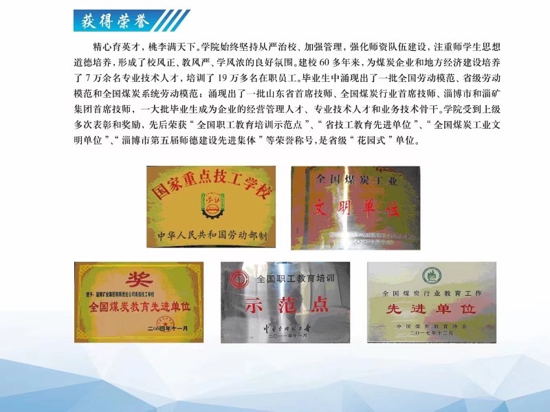 山东煤炭技术学院是经山东省人民政府批准成立的公办全日制技工院校,隶属于山东能源淄矿集团,前身是始建于1951年的淄矿集团高级技工学校,从诞生起,学院先后经历了淄博矿务局技工学校、淄矿集团高级技工学校、山东煤炭技术学院等几个历史发展时期,办学70余年始终秉承“以终为始、变革图强”办学宗旨,深入践行“厚德博学、融慧创新”校训精神,勇毅奋发、薪火相传,积淀形成了“教以厚德、导以爱心”的校风,培养了数十万各类技能人才,先后荣获“全国职工教育培训示范点”、“省技工教育先进单位”等荣誉称号。