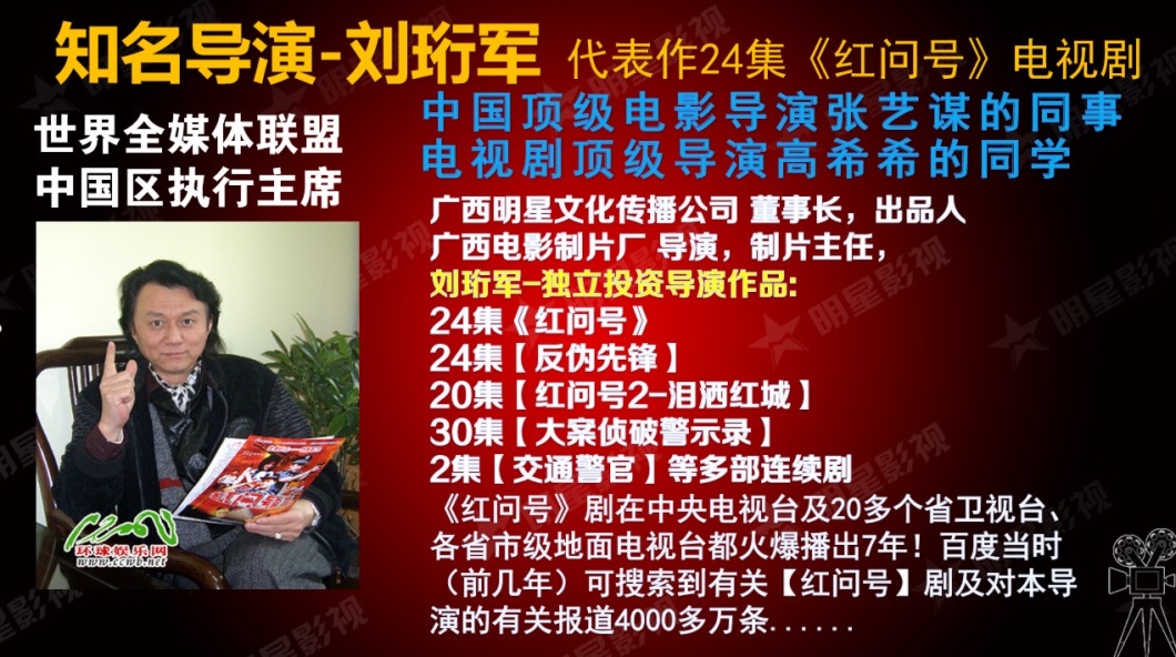 广西明星文化传播有限公司董事长、出品人、导演:刘珩军(是中国顶级电影导演张艺谋的同事、是中国顶级电视剧导演高希希的同班同学)公司于一九九三年创办以来迅速发展、升级、壮大,驰骋影视界。是广西成立最早、规模最大的影视文化传播公司之一,在广西的影视、广告界中知名度高,一直走在同行业界的前列。2000年起,明星公司开始斥巨资独立投入拍摄电视剧、电视专题片。 已独立投资拍摄了三十集电视系列纪实片《 大案侦破警示录 》并向全国发行播出。2002年独立投资拍摄完成二十四集电视连续剧《红问号》,并在全国各省市和卫视台、中央电视台向全国播出,收视率已名列前茅, 特别在江浙地区达到当时收视最高。因此而成为广西影视第一人!