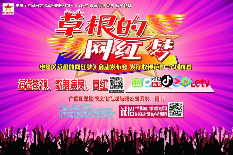另将筹拍网络大电影《草根的网红梦》及微电影短视频搞笑段子发抖音、快手平台等。因此长期招聘主持人、主播、演员、礼仪模特及包装打造网红、培养影视人才!