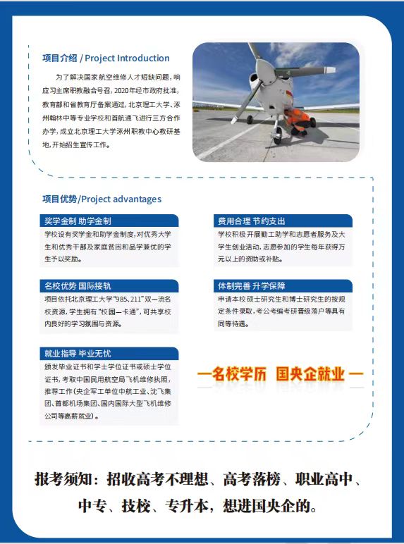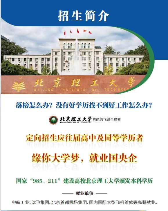 北京理工大学首航通飞联合培养招生计划。本校是国家教育部直属高校,是国家985和211双一流重点大学。招生应往届高中及同等学历者,计划外自主招生考试录取,全日制联合培养学制四年,每年助学补贴2万左右。学习期满成绩合格通过评审颁发北京理工大学大学成考本科和学士学位。推荐央企军工单位中航工业、沈飞集团、首都机场集团、国内国际大型飞机维修公司等高薪就业。