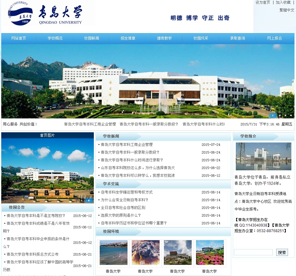 青岛大学位于美丽的海滨城市青岛,坐落在黄海之滨、浮山之麓,依山傍海,风景秀丽。经过多年发展,现已成为规模较大、学科齐全、水平较高、师资优良、享有较高社会声誉的综合性大学。这里学者云集,既有深厚的文化底蕴,又充满浓郁的时代气息,是读书治学的理想园地。 根据学生报名资料,经学校审核研究同意,予以录取并发放入学通知书。考生根据入学通知书及《新生入学报到须知》,在规定时间报到入学。 报到地点:1.青岛市宁夏路308号青岛大学中心校区,乘坐321、31、227、226、316、104路公交车到青岛大学。 报到时间:2014年8月中旬,详见《新生入学报到须知》。