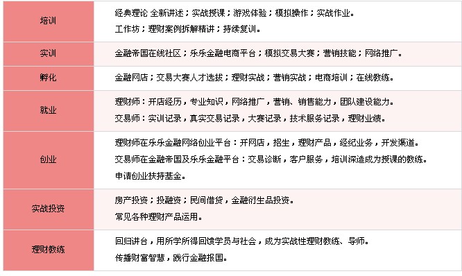 | 创业 | 理财师在乐乐金融网络创业平台:开网店,招生,理财产品,经纪业务,开发渠道。 交易师在金融帝国及乐乐金融平台:交易诊断,客户服务,培训深造成为授课的教练。 申请创业扶持基金。 |