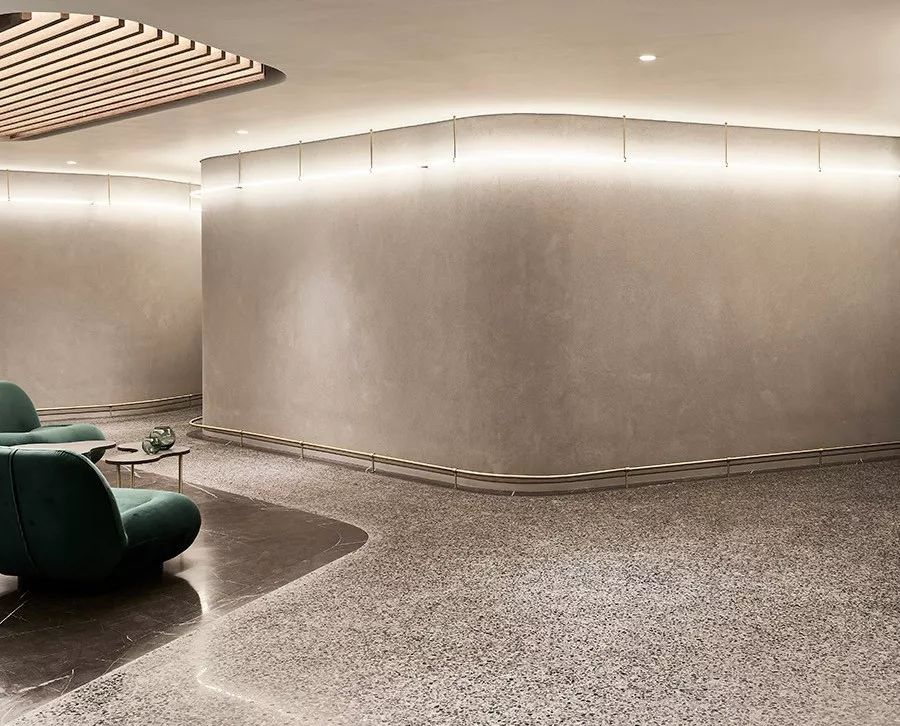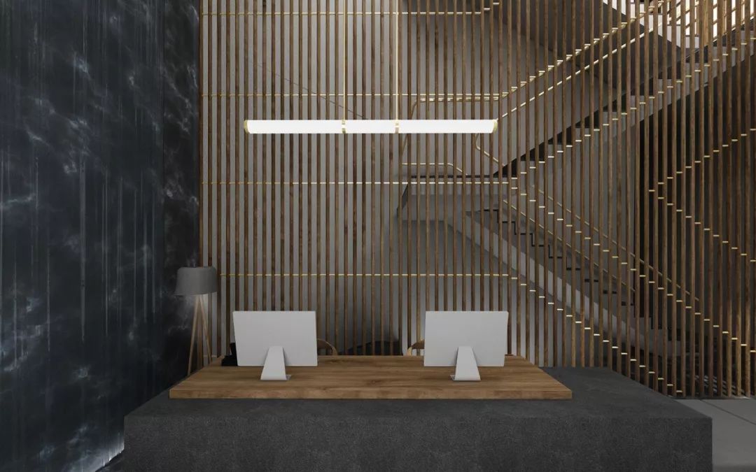 大堂,一面木质的格栅墙作为背景,增加流线感的同时,也让整体看起来更加自然大气。