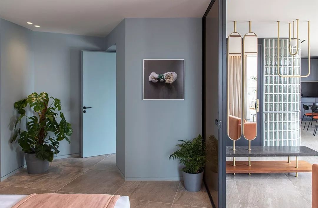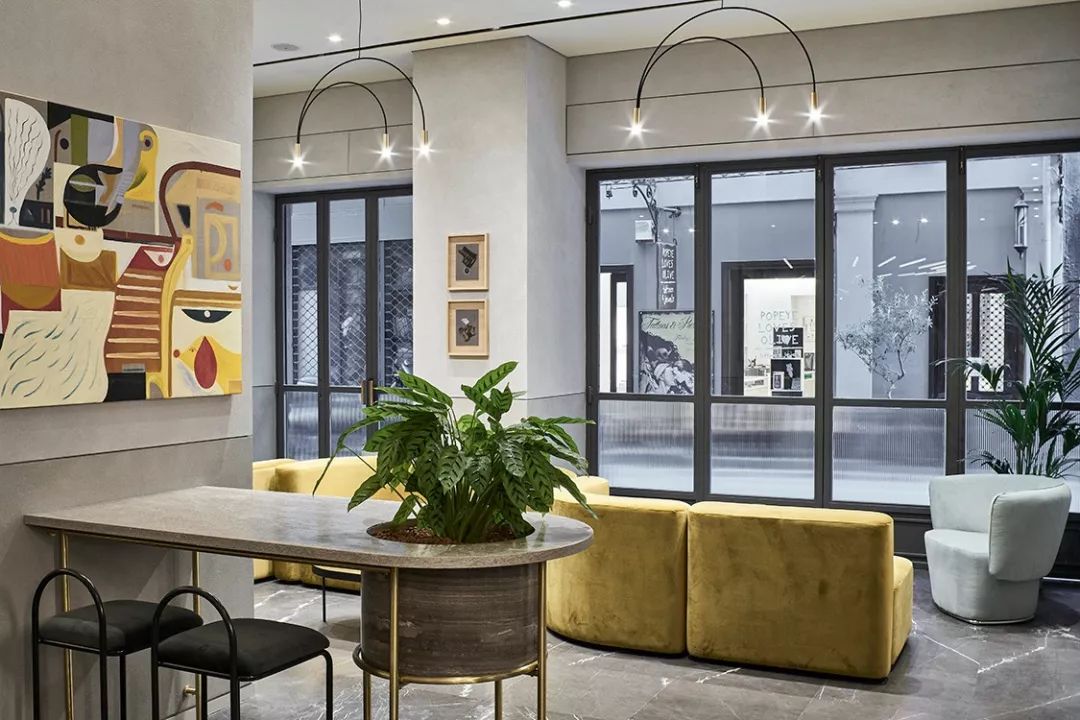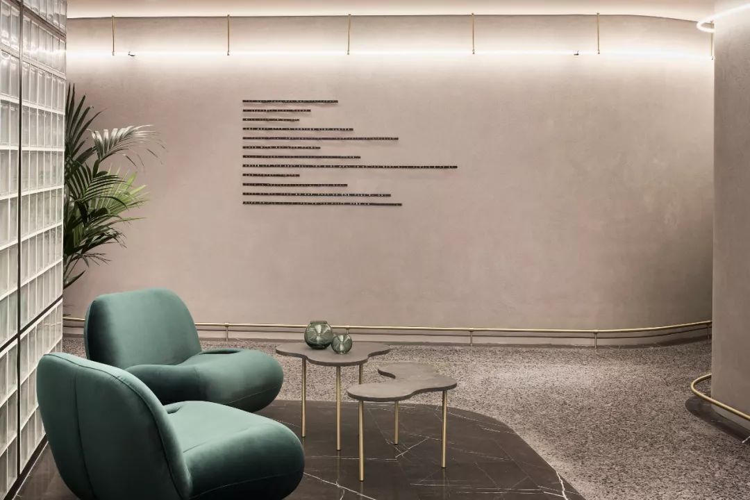 公区整体色调雅致,包括了绿灰色、蓝灰色、豆沙色等,其中也不乏很多当地艺术家的艺术作品。