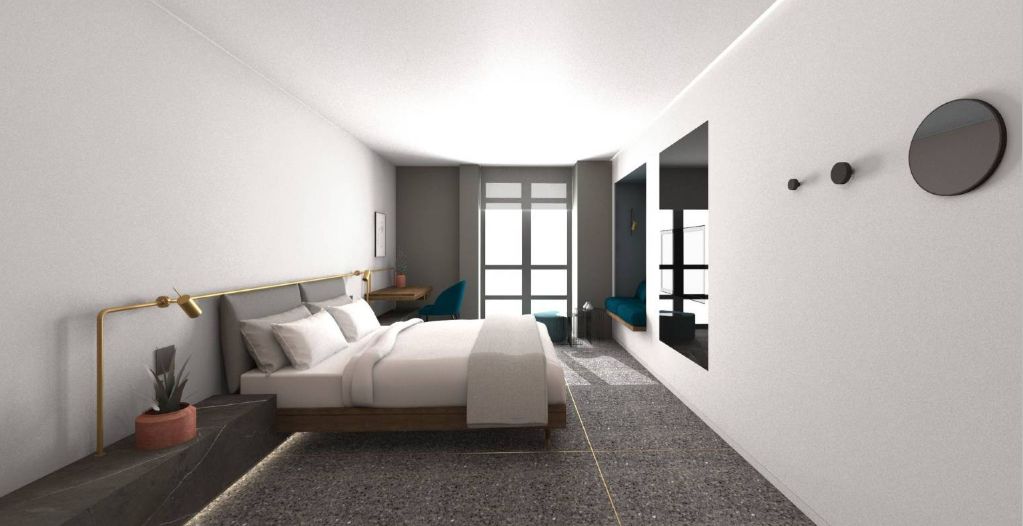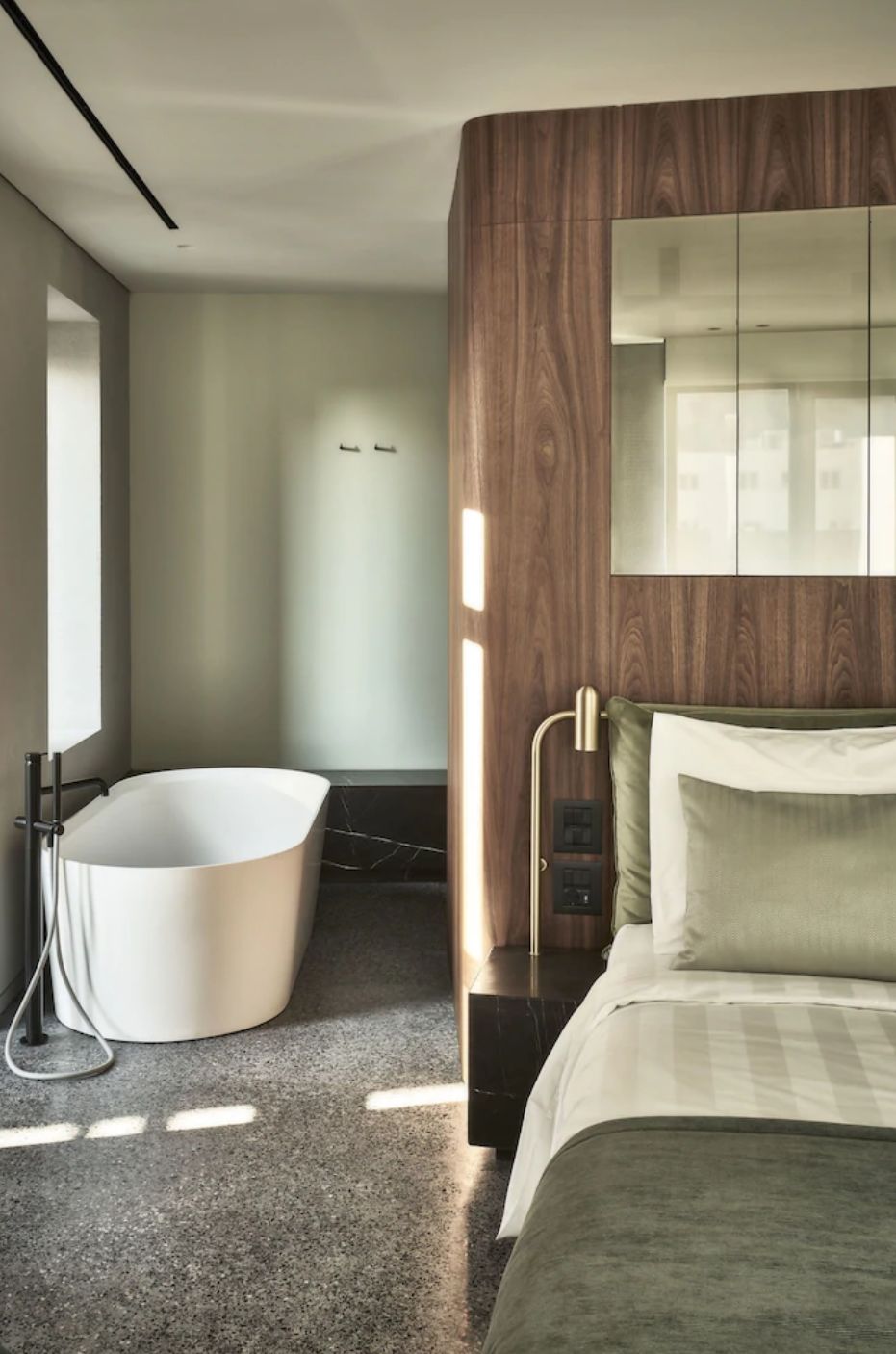 酒店内的走廊布局模仿了雅典市中心的城市布局,上面的连续灯带与底部的管状踢脚线相呼应,一直通向客房入口。
