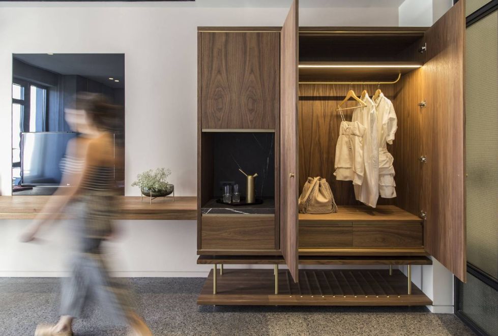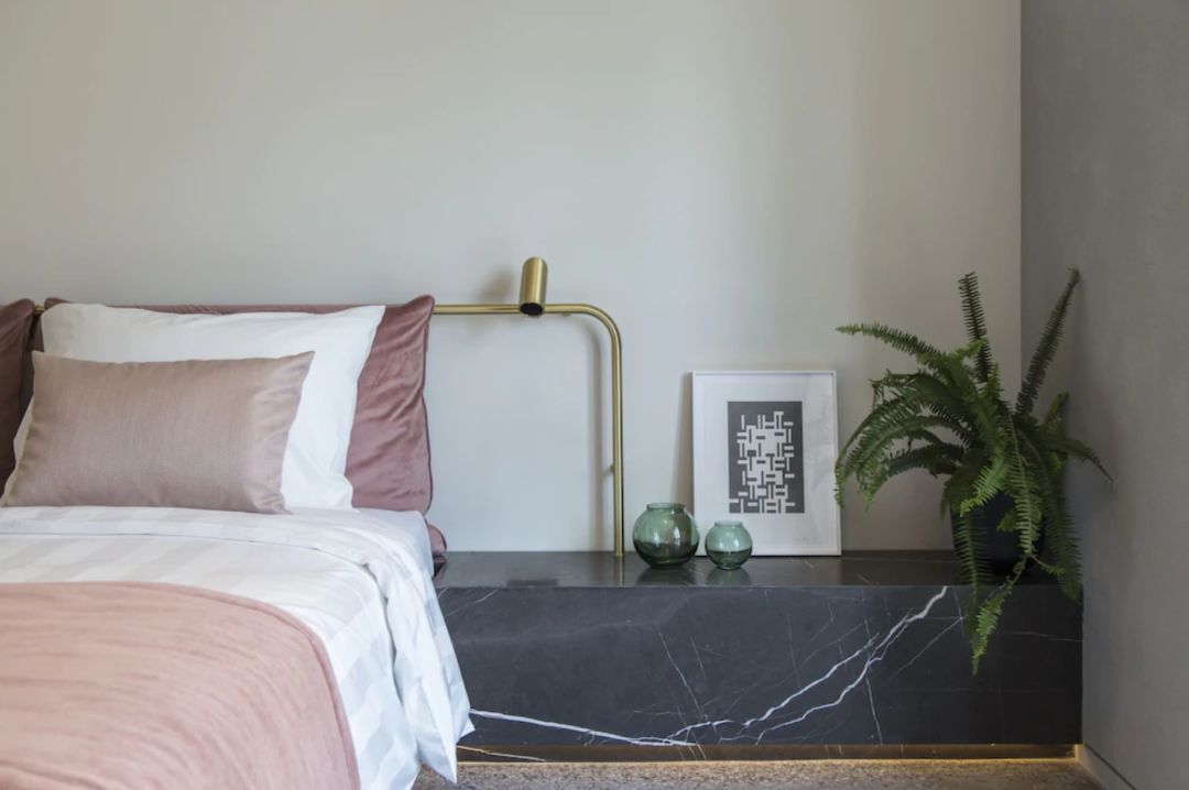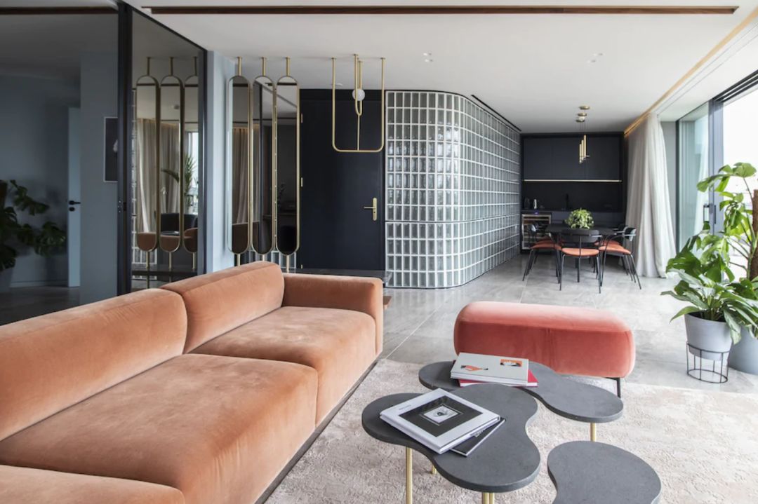 室内包括水磨石地板,腮红天鹅绒内饰,简约的沙发、金属线条的灯具和床,以及带有胡桃木装饰和黄铜色调的野兽风格定制家具,都是工作室强调的现代主义风格。