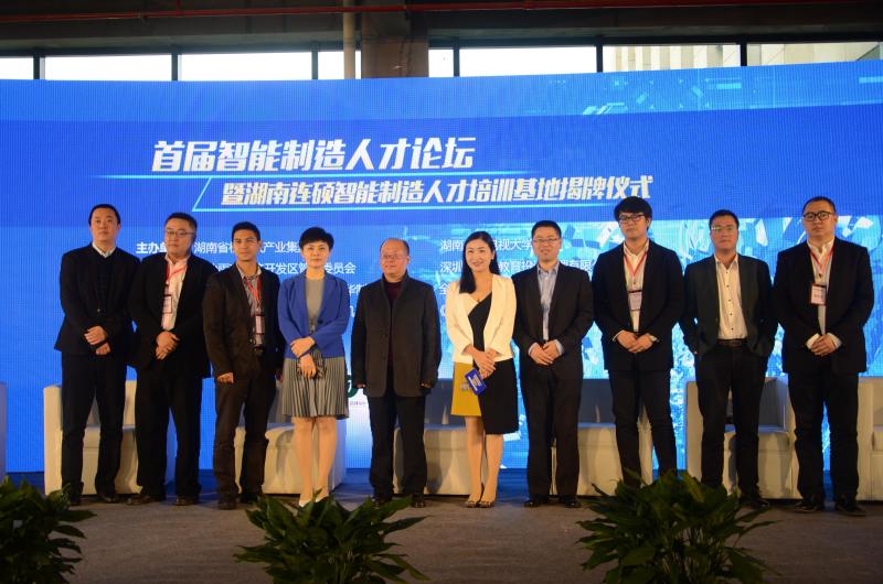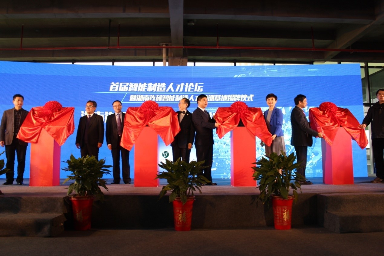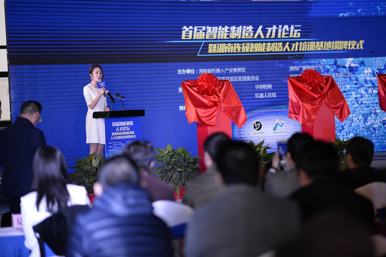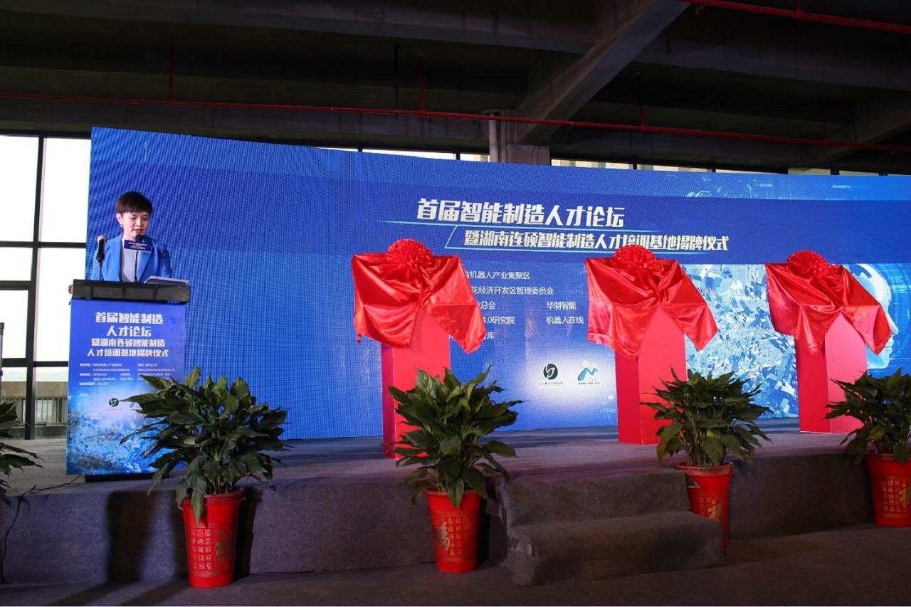 然后,杨娅董事长与部分政府、院校领导共同揭牌:湖南连硕智能制造人才基地、湖南广播电视大学与湖南网络工程学院机器人实训基地、湖南科技职业学院机器人实训基地、湖南智能制造人才服务中心。