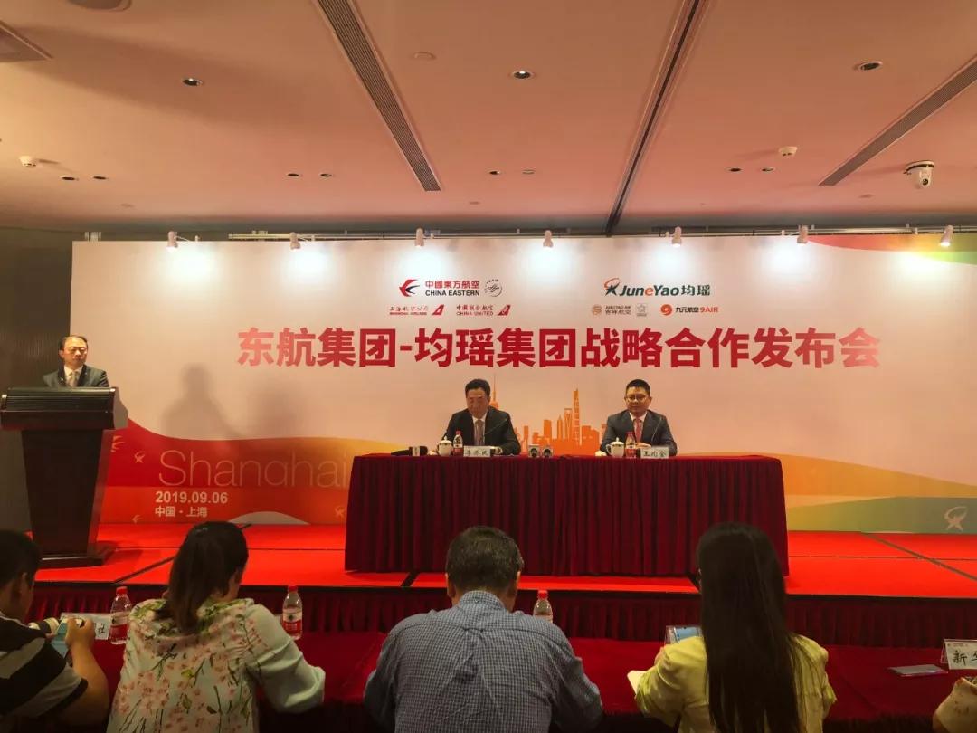 东航集团总经理、党组副书记李养民和均瑶集团董事长、吉祥航空董事长王均金出席媒体新闻发布会