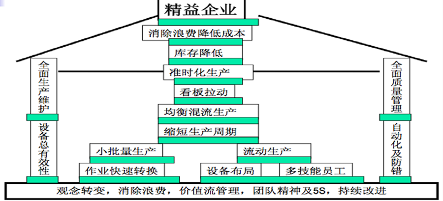 精益生产是通过消除企业所有环节上的不增值活动,达到降低成本、缩短生产周期和改善质量的目的。精益生产,是当前工业界最佳的一种生产组织体系和方式。企业精益体系的构成就如图所示。