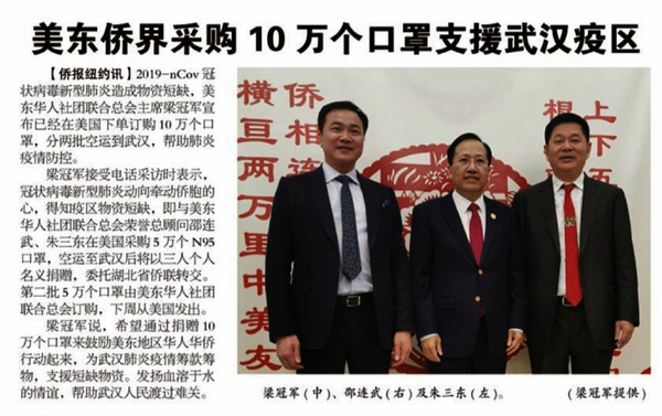 美东华人社团联合总会主席、华软学院梁冠军董事长与美东华人社团联合总会荣誉总顾问邵连武、朱山东采购10万个口罩支援武汉疫区(资料图片)