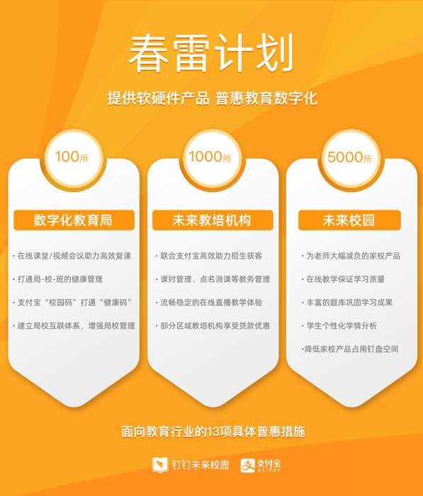 钉钉和支付宝此次推出普惠教育行业数字化的13项具体帮扶措施,涵盖复课平台、复学防疫、家校沟通、教务管理、在线课堂、学生学情分析、教培招生、金融贷款优惠等方面的具体支持。这是阿里巴巴扶助中小企业“春雷计划”的一揽子延伸措施,旨在充分发挥阿里的数字化技术能力,加速社会各行各业数字化转型升级。