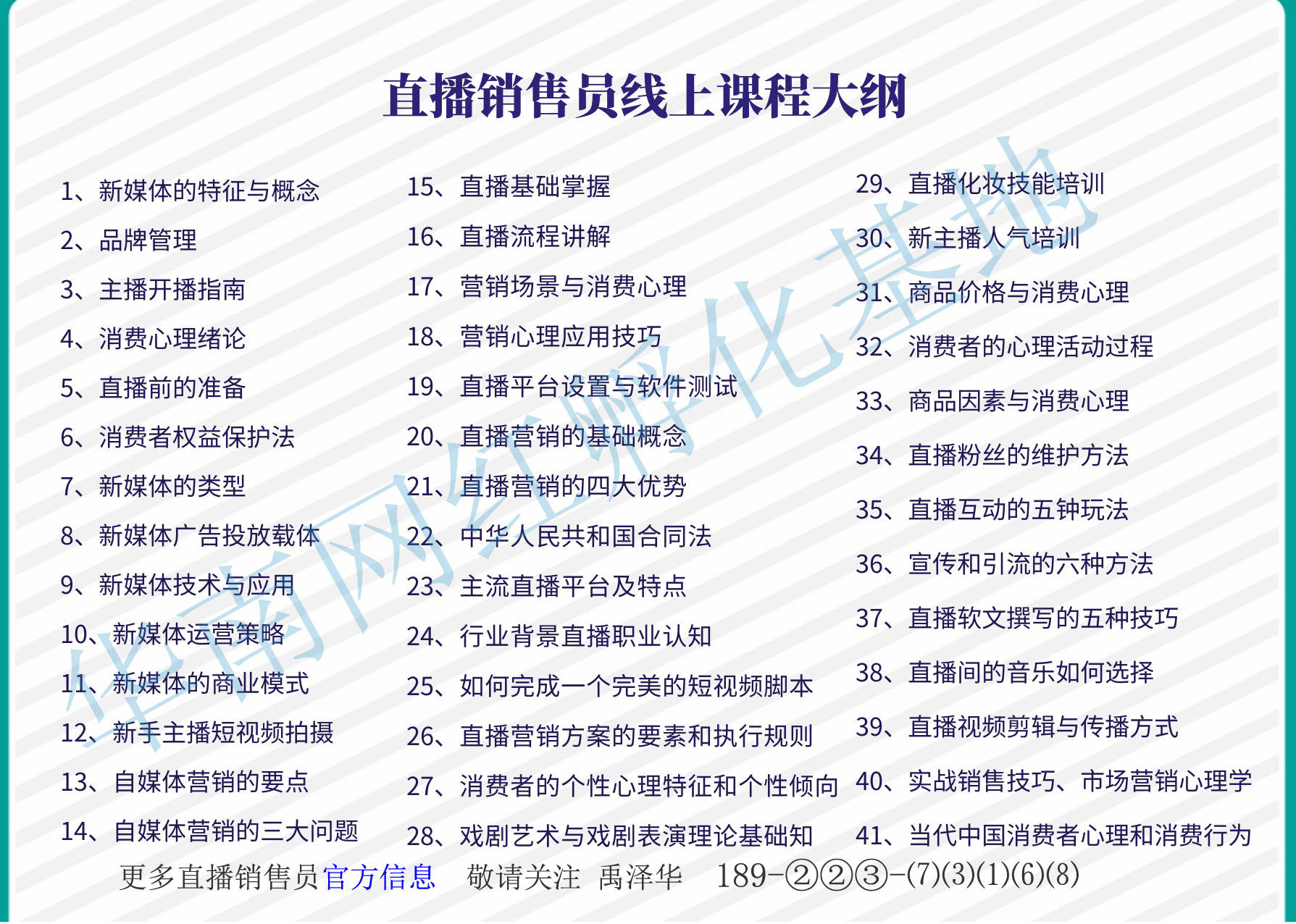 华南网红孵化基地为国家新职业《直播销售员》培训认证服务授权基地,基地一直秉承着“实操为标、实用为准、落地变现为王“的培训理念。并结合国家新职业岗位培训官网的直播销售员线上培训教材,通过线上理论、线下实操、小班制导师一对一辅导最新培训模式,确保每一个学员,毕业之后,都能熟练掌握以下技巧技能及落地实操实战。