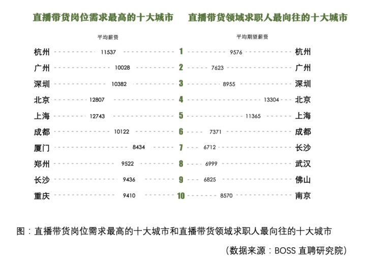 数据显示,杭州、广州、深圳分别是直播带货岗位需求最高的三大城市,其次是北京与上海,排名靠前的其余城市也基本为新一线城市。可以看到,这些城市基本都有丰富的电商相关资源与供应链渠道。