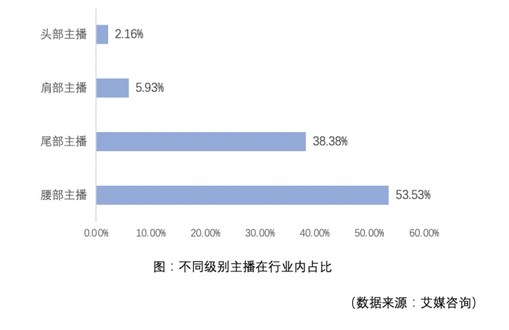 直播带货行业的二八效应也十分显著。数据显示,头部主播在带货主播中仅占2.16%,尾部主播和腰部主播则占到近90%以上。