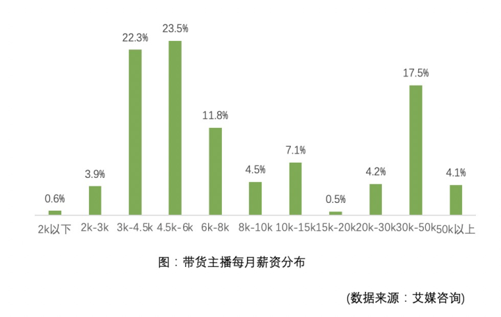 同样,收入方面,超50% 的主播的每月薪资集中在3000元-6000元区间,而仅约20%的主播收入超2万元,不同级别的带货主播收入差距极大。