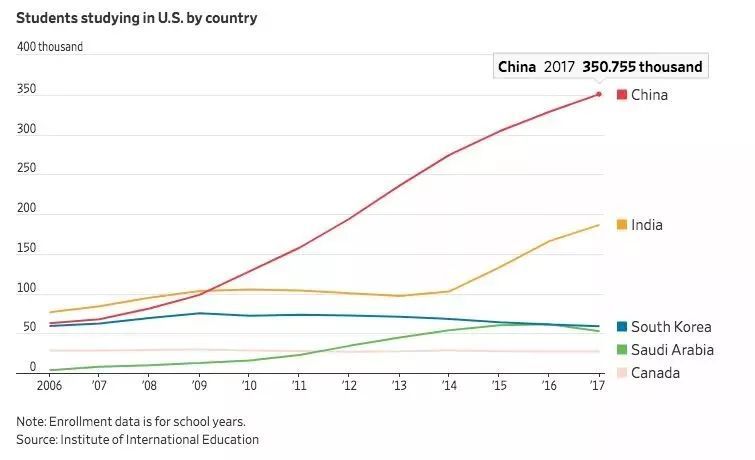 《华尔街日报》也认为,国际留学生的学费让学校成为了美国最成功的出口产业之一。而中国学生数量比任何其他国家都多。